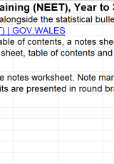 This release summarises the Annual Population Survey statistics on young people not in education, employment or training (NEET) in Wales. The definitive source for NEET information is the annual statistical first release (SFR), Participation of young people in education and the labour market, which uses a range of data sources to estimate participation. The latest SFR release provides final estimates for 2021 and provisional estimates for 2022.
